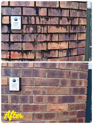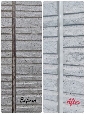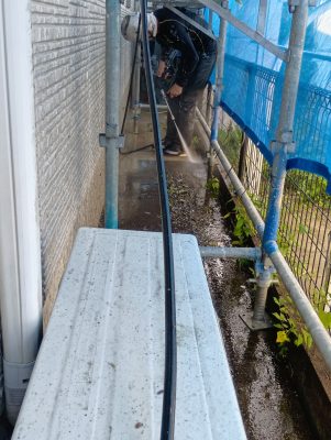 まずは、高圧水洗浄で家全体の藻や苔、汚れを落としていきます。